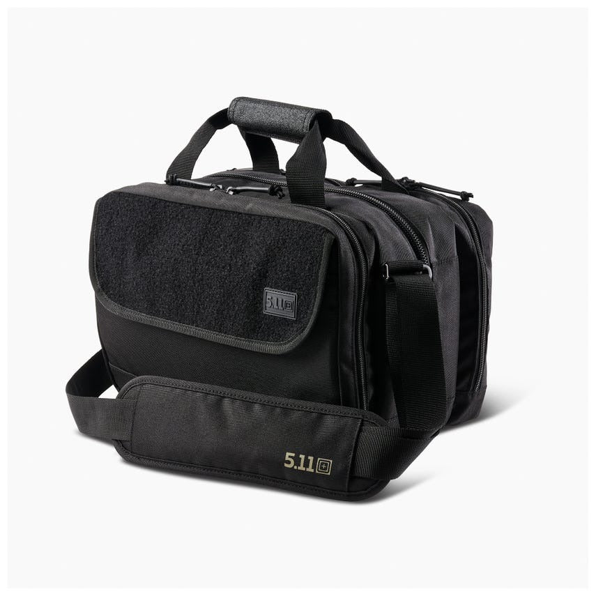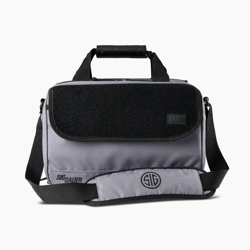Keeping organized is easy with the multi-pocket Range Ready Qualifier bag. This tough, padded bag measures 13" L x 9" W x 8.75" H and comes equipped with lockable YKK zippers in an exclusive SIG Sauer colorway. The Qualifier is constructed from durable, all-weather 600D polyester with a TPU bottom to protect your gear. A zippered clamshell front pocket includes a document slip pocket, elastic band loops and a wipe-clean disassembly panel. In the main pocket, we added two padded, zippered pistol storage pockets, plus a removable divider with elastic bands and a web MOLLE panel. Dual rear zippered pockets with MOLLE facing hold extras. A top grab handle and removable padded shoulder strap make the Range Ready Qualifier an ideal grab-and-go solution for pistol training and qualifications.