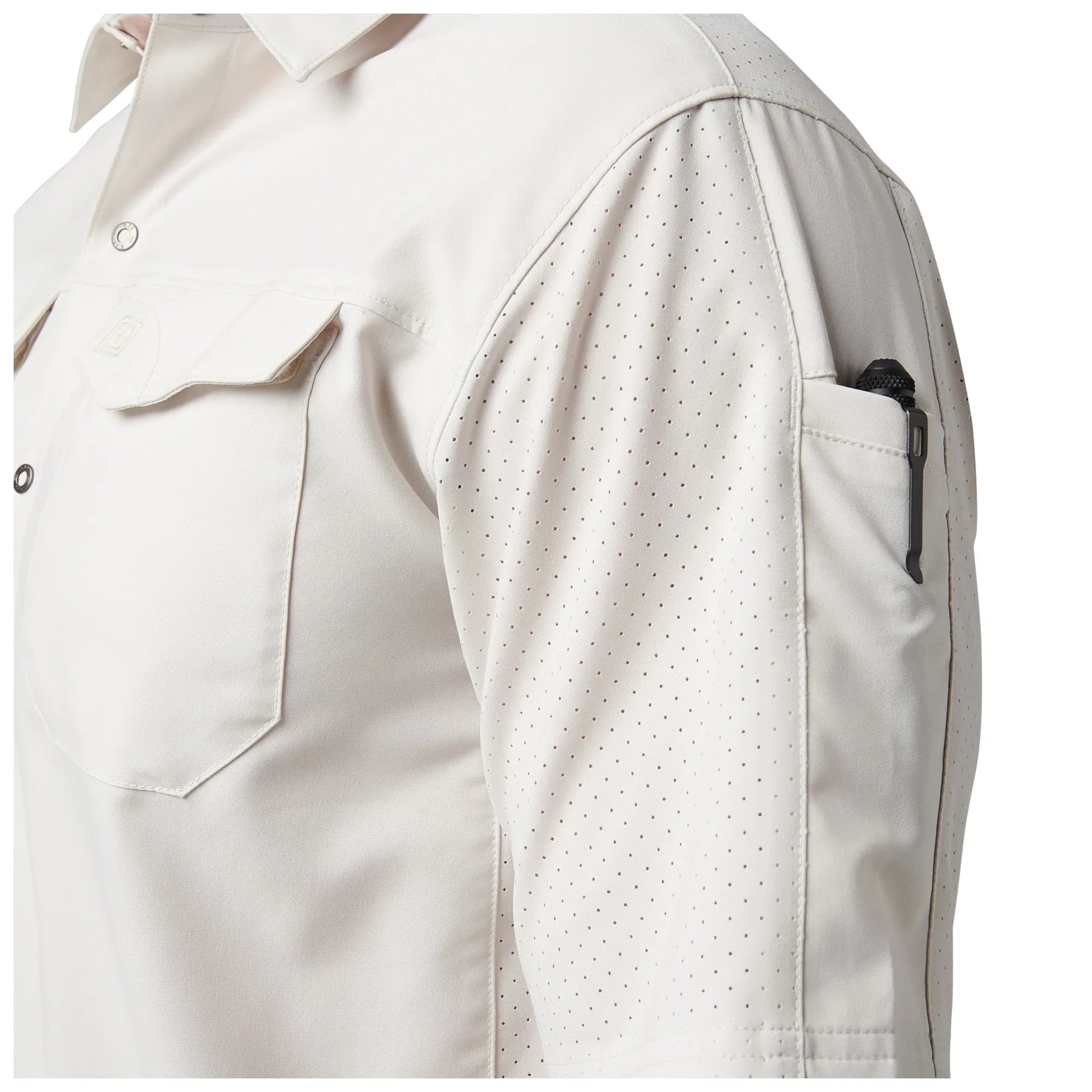 - Perforated fabric under arm, sleeve, and back yoke for breathability